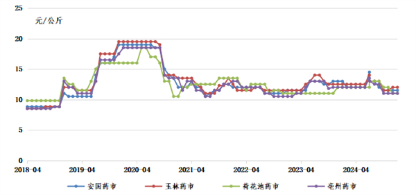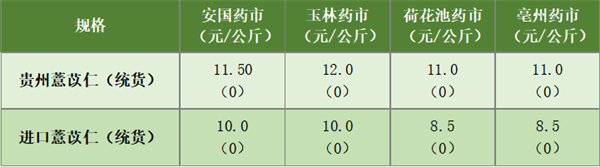 2025年2月,安国中药材市场薏仁米价格为11.50元/公斤,玉林中药材市场薏仁米价格12.00元/公斤,亳州中药材市场薏仁米价格11.00元/公斤,荷花池中药材市场薏仁米价格为11.00元/公斤。