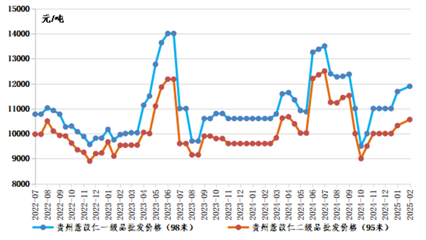 2月中旬,各规格薏仁米呈上行走势,其中贵州薏苡仁(95米)上涨为2.33%。