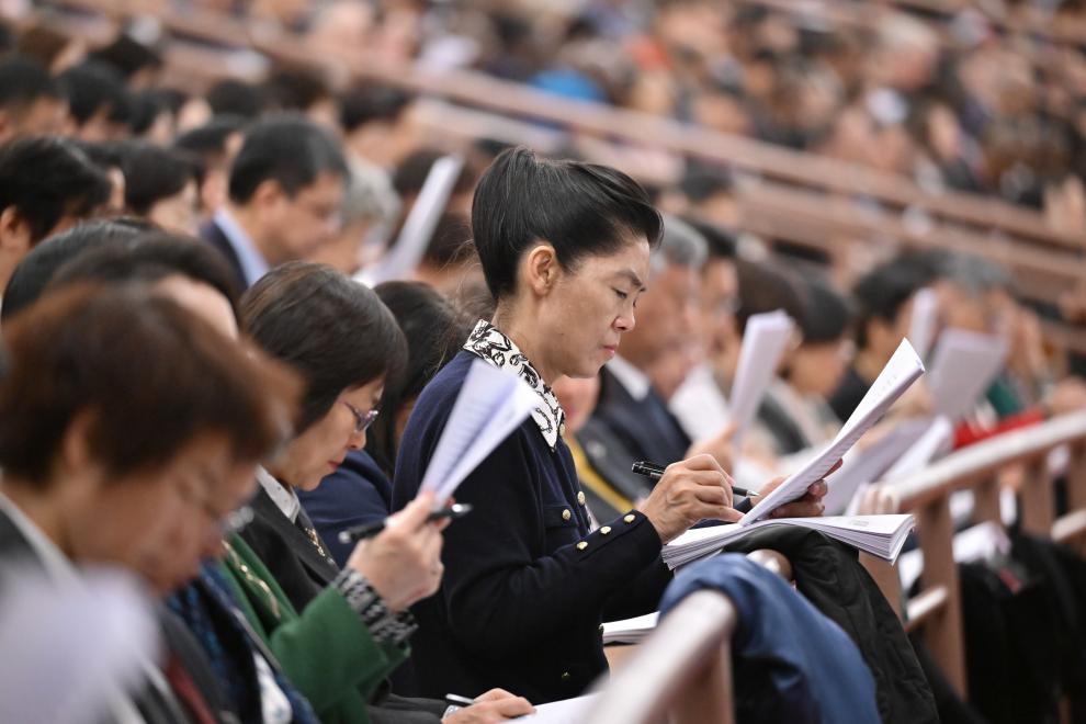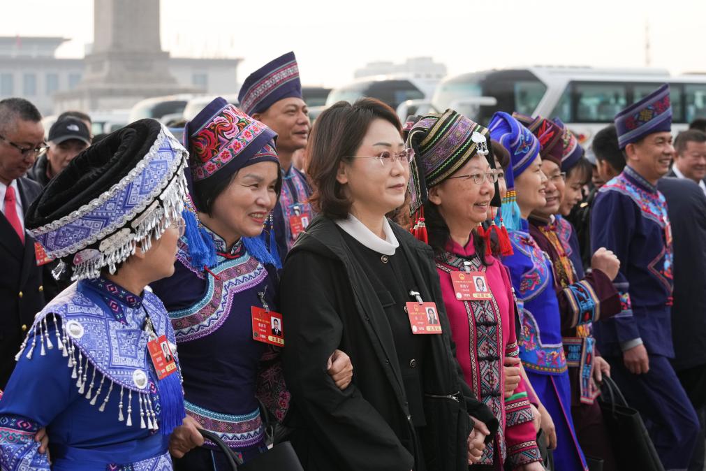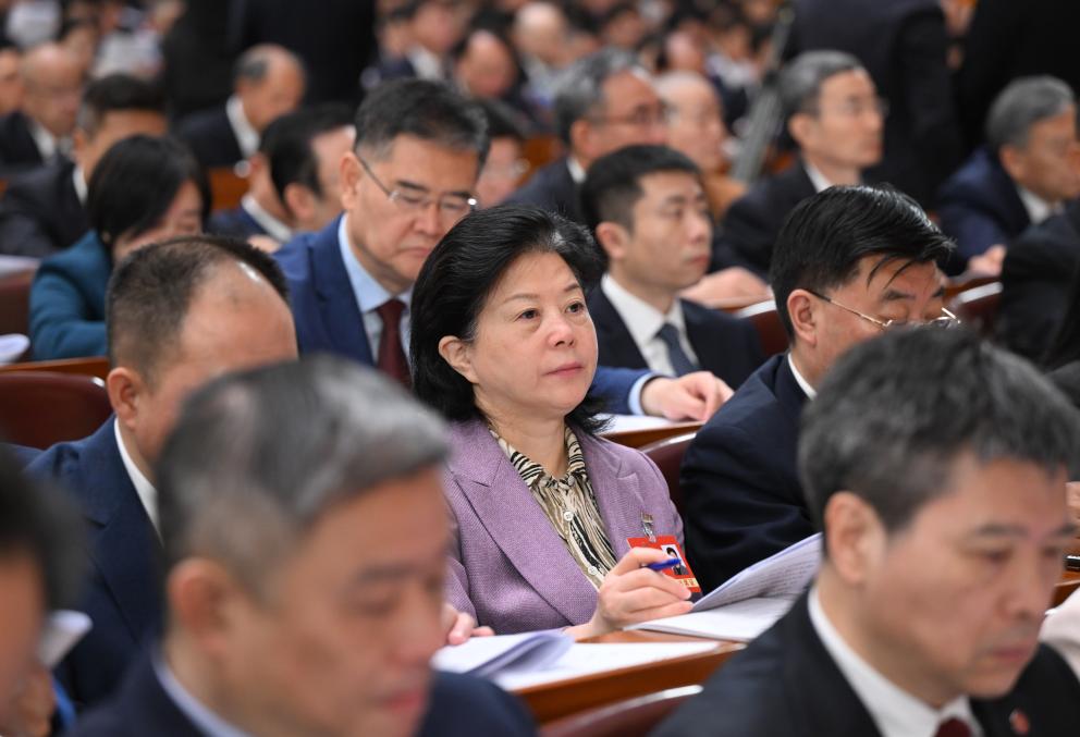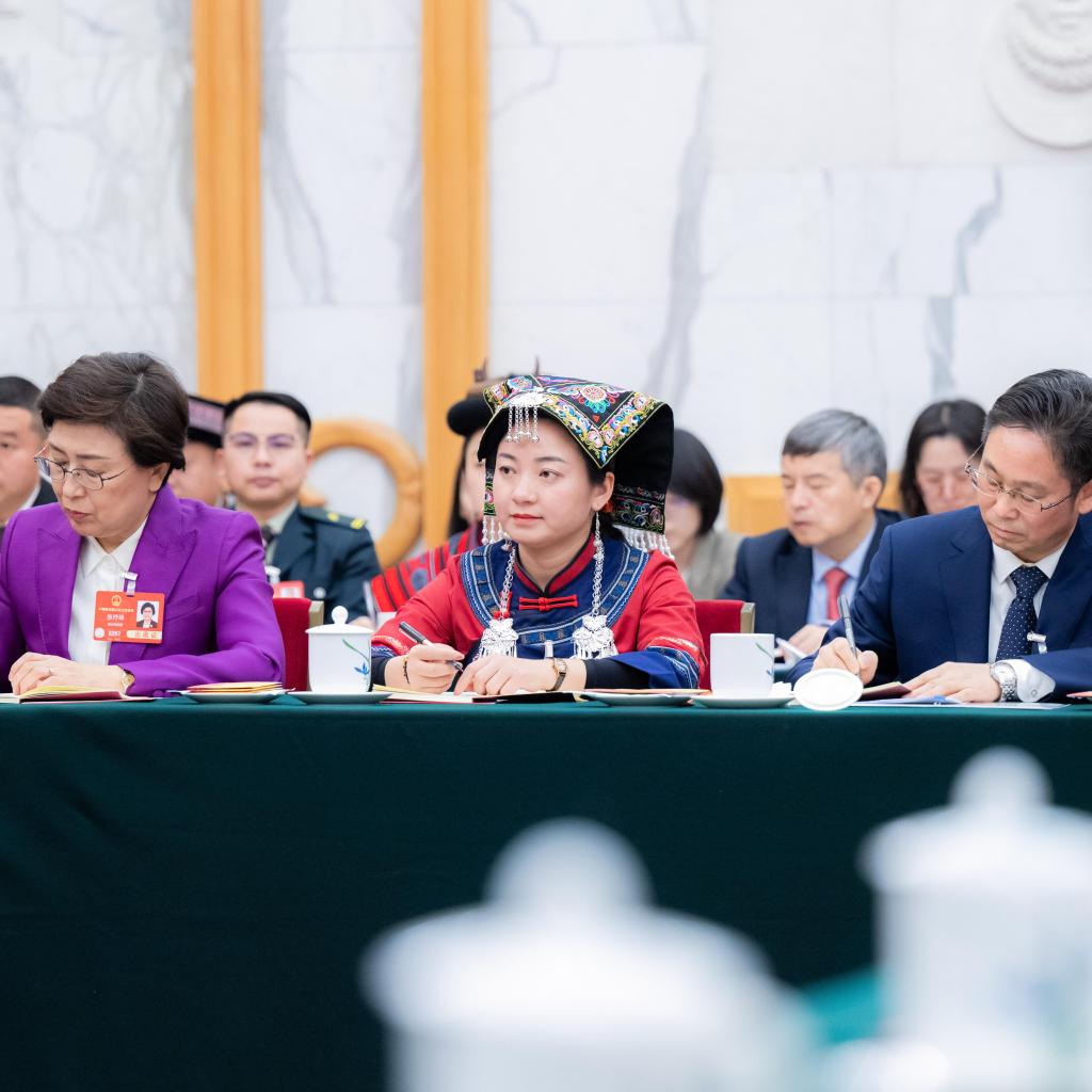 3月5日,卢丹(中)在贵州代表团全体会议上认真听会。当日下午,十四届全国人大三次会议各代表团举行全体会议,审议政府工作报告。