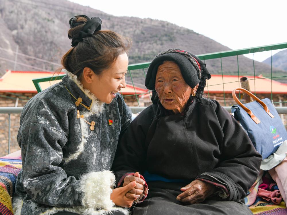 2月18日,在四川省阿坝藏族羌族自治州马尔康市松岗镇松岗村,格西王姆在97岁老人周幺妹的家中了解高龄补贴领取情况。