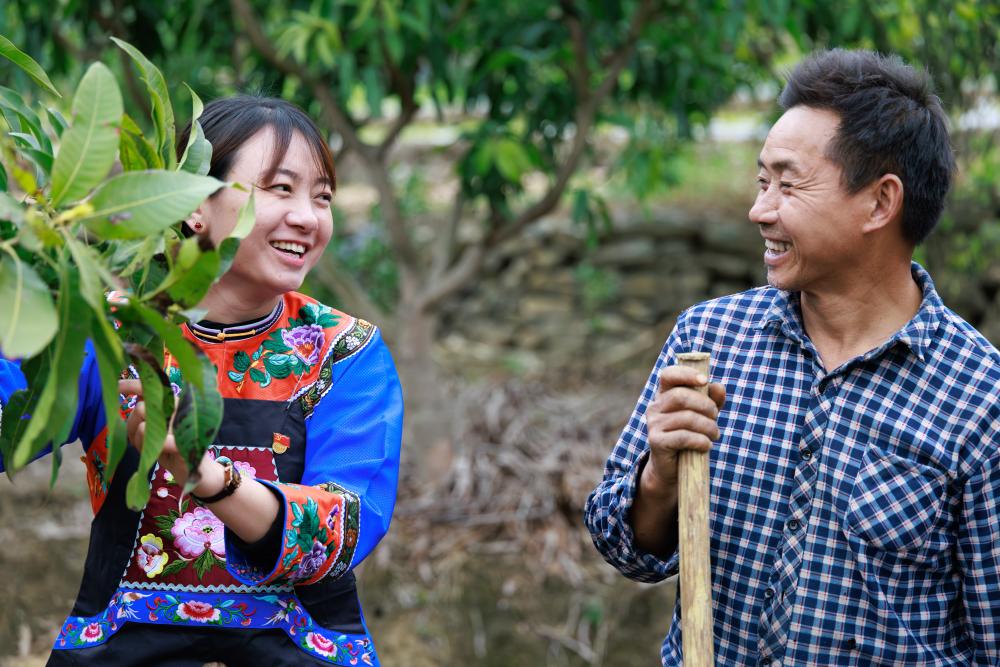 2月20日,在贵州省安顺市镇宁布依族苗族自治县六马镇致富村,卢丹(左)与村民刘发志交流芒果种植情况。