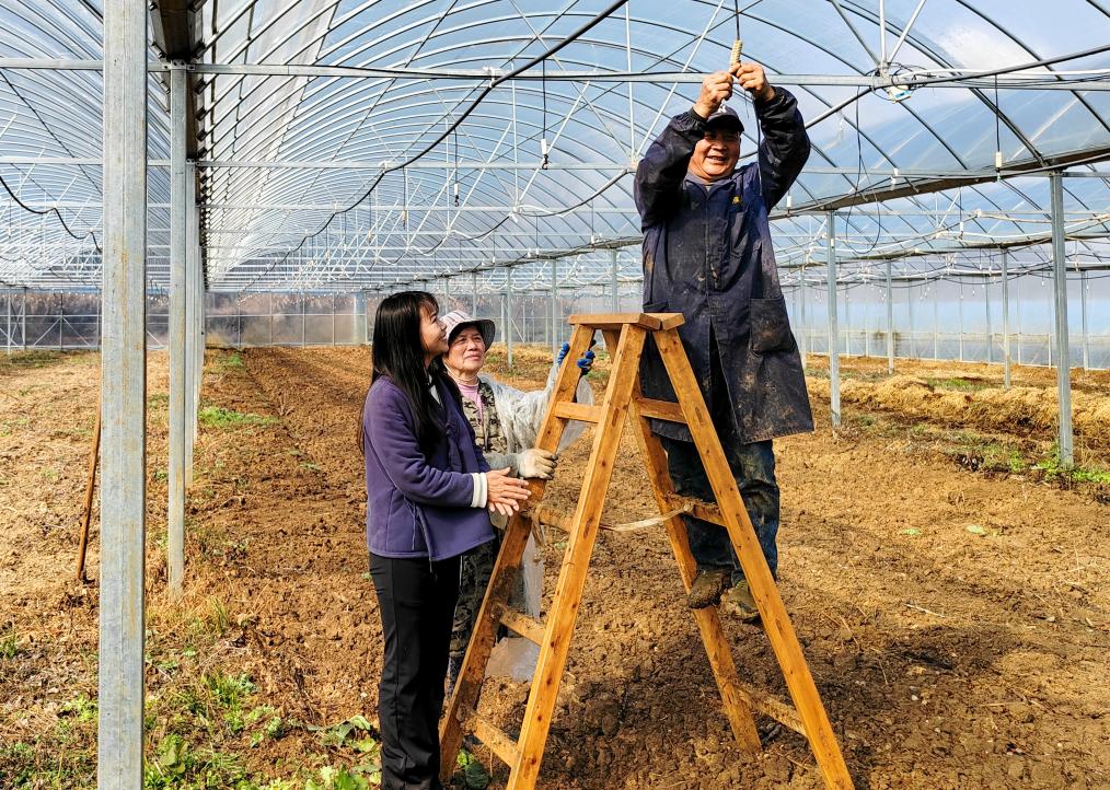 2月18日,在湖北省赤壁市中伙铺镇安丰村,田淑娴(左)指导村民检修大棚喷灌设备。