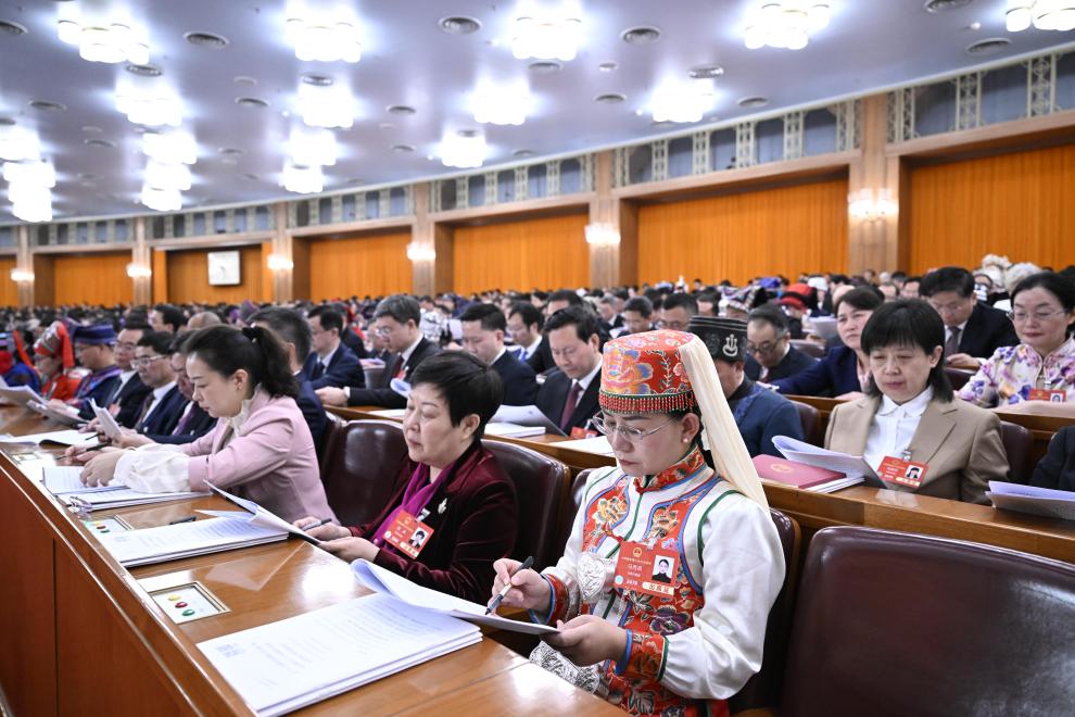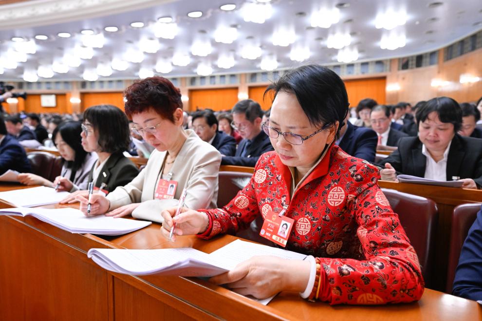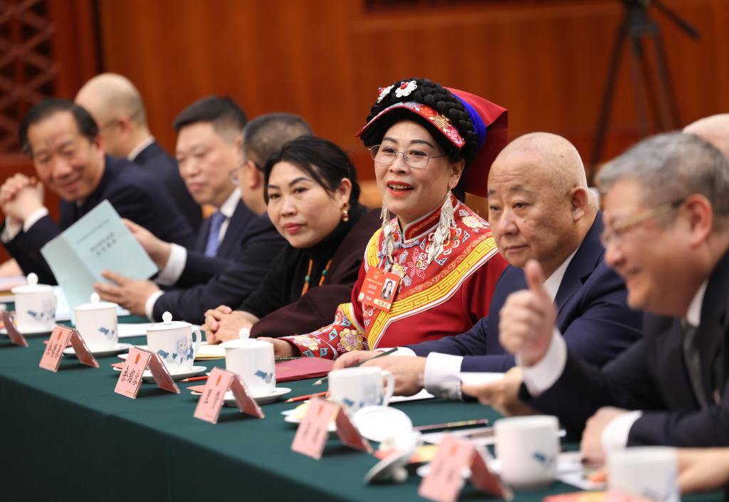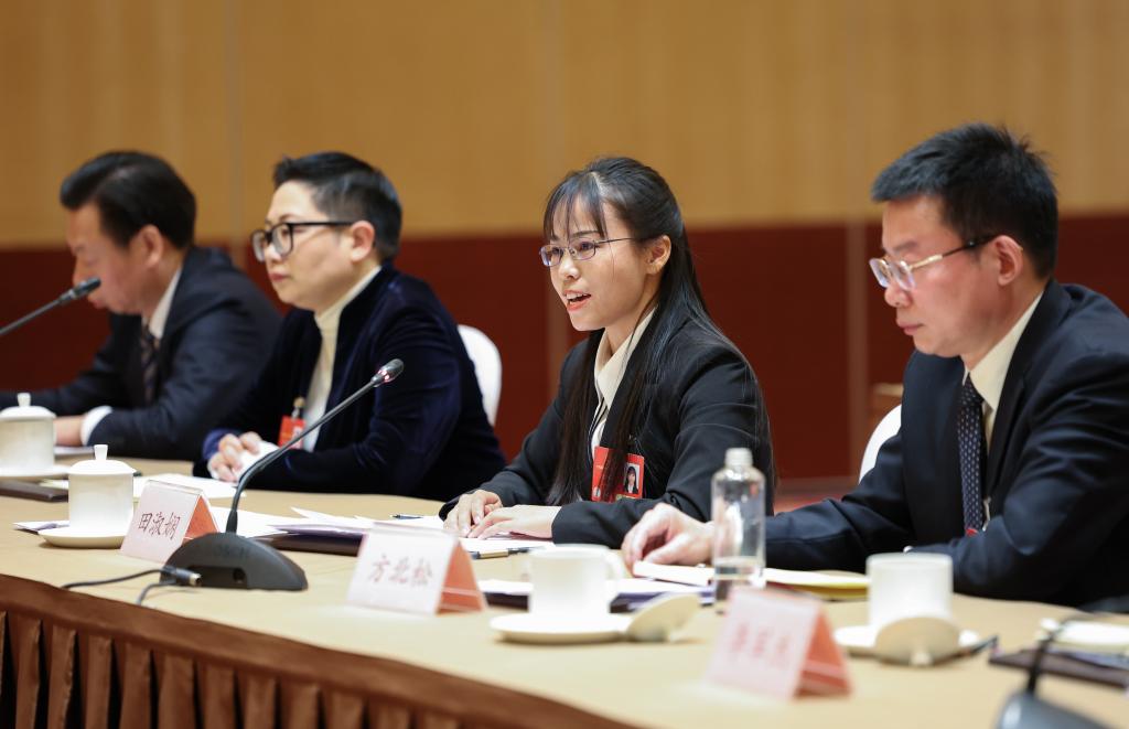 3月6日,全国人大代表田淑娴(右二)在十四届全国人大三次会议湖北代表团开放团组会议上发言。