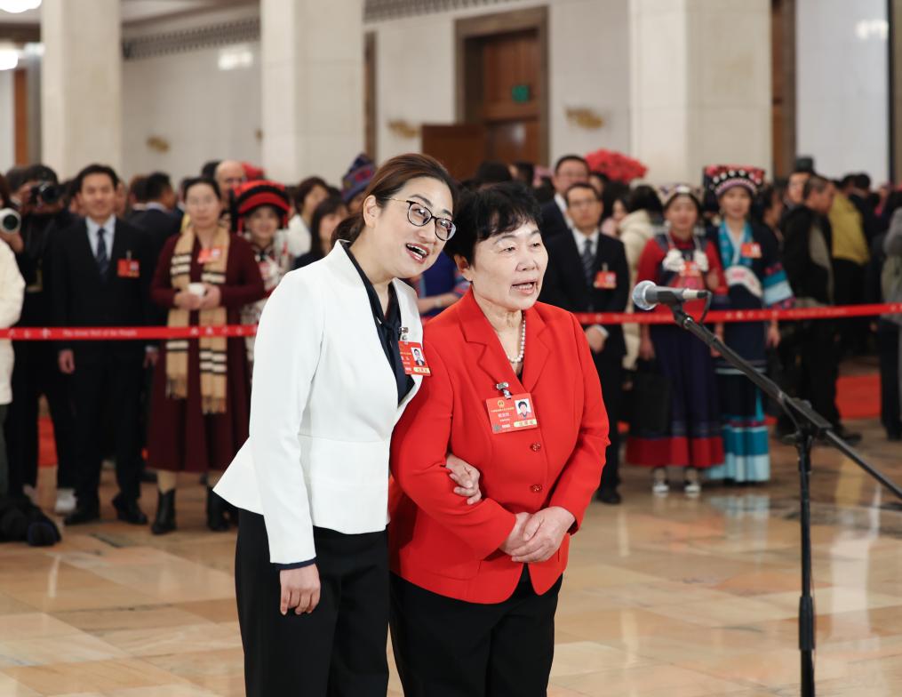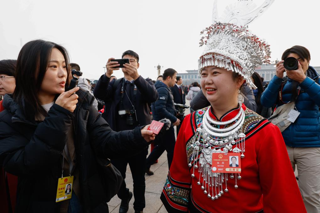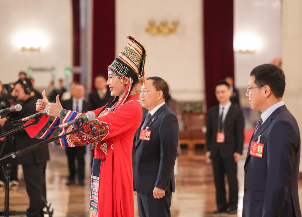 3月5日举行的首场“代表通道”集中采访活动中,全国人大代表格西王姆接受媒体采访。