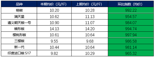 本期全国辣椒市场的8个辣椒代表品种(艳椒、满天星、遵义朝天椒一号、锥形椒、樱桃形椒、三樱椒、新一代、印度进口椒S17)交易平均价格均较上期有所下跌。其中满天星环比指数为954.57点,是本期均价跌幅最大品种。