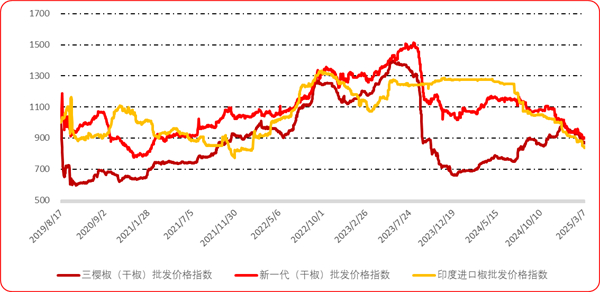 新华财经北京3月11日电(李欣仪)截至2025年3月9日,中国遵义朝天椒(干椒)批发价格指数报1237.82点,较上期下跌2.51%,其中樱桃形椒批发价格指数较上期出现上行;艳椒、满天星、遵义朝天椒一号、锥形椒批发价格指数较上期出现下行。三樱椒(干椒)批发价格指数报867.41点,较上期下跌1.04%。新一代(干椒)批发价格指数报896.48点,较上期下跌1.18%。印度进口椒批发价格指数报837.86点,较上期下跌6.35%。