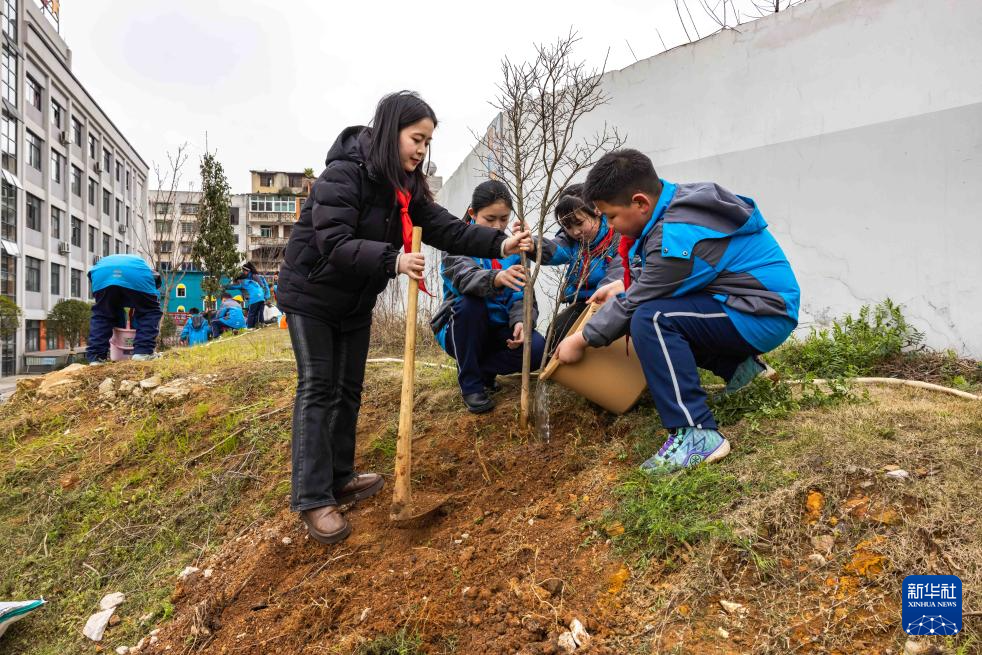 3月12日,老师和学生在贵州省安顺市第七小学参加义务植树活动。新华社发(陈熙摄)