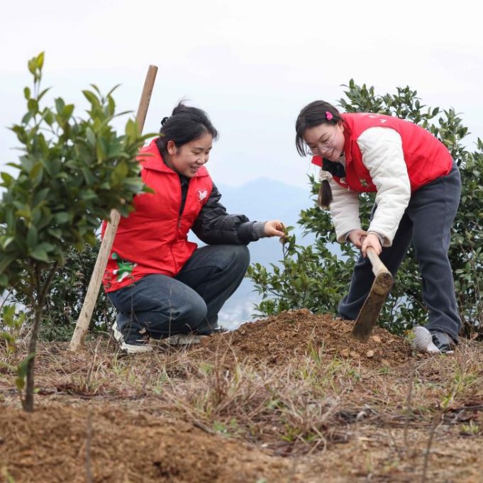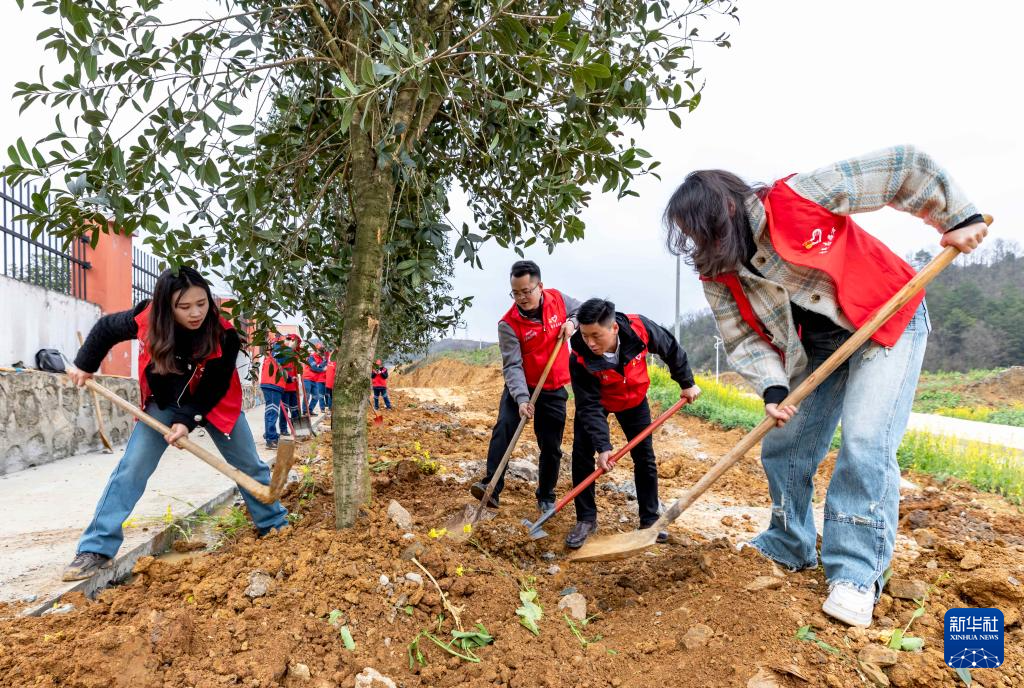 3月12日,青年志愿者和学生在贵州省黔西市惠风学校校区参加植树活动。新华社发(范晖摄)