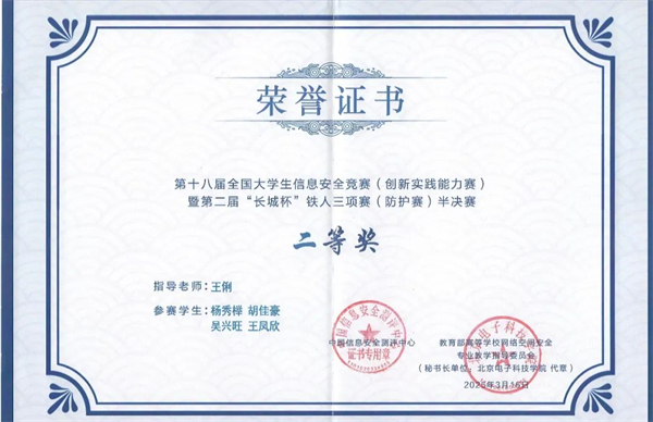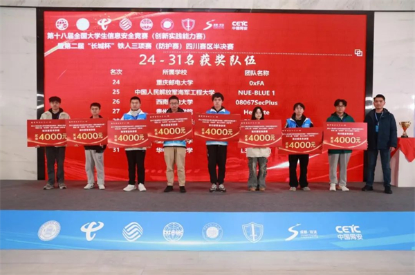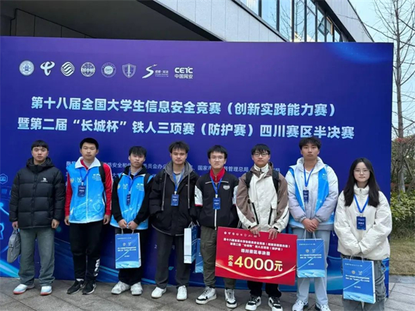 从四川赛区初赛中晋级的100支队伍,380名网安高手在半决赛中同台竞技。经过激烈角逐,由王俐老师指导的,杨秀榉、胡佳豪、吴兴旺、王凤欣四位同学组成的“HexByte”团队荣获二等奖;由王寅庆老师指导的,付志力、金玉桂、罗引瑞、卢来四位同学组成的“团团又队队”团队获得三等奖。
