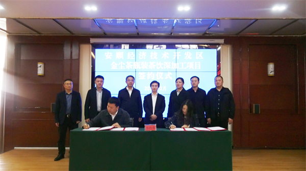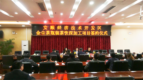 近日,安顺经开区金尘茶瓶装茶饮深加工项目签约仪式举行。贵州金尘茶茶叶发展有限公司董事长葛小松,区党工委书记宋春雨,党工委副书记、管委会主任于一丁,区领导王星明、张宇栋、谢登峰出席签约仪式,区投促局、工贸局、管理运营公司等相关部门参加仪式。