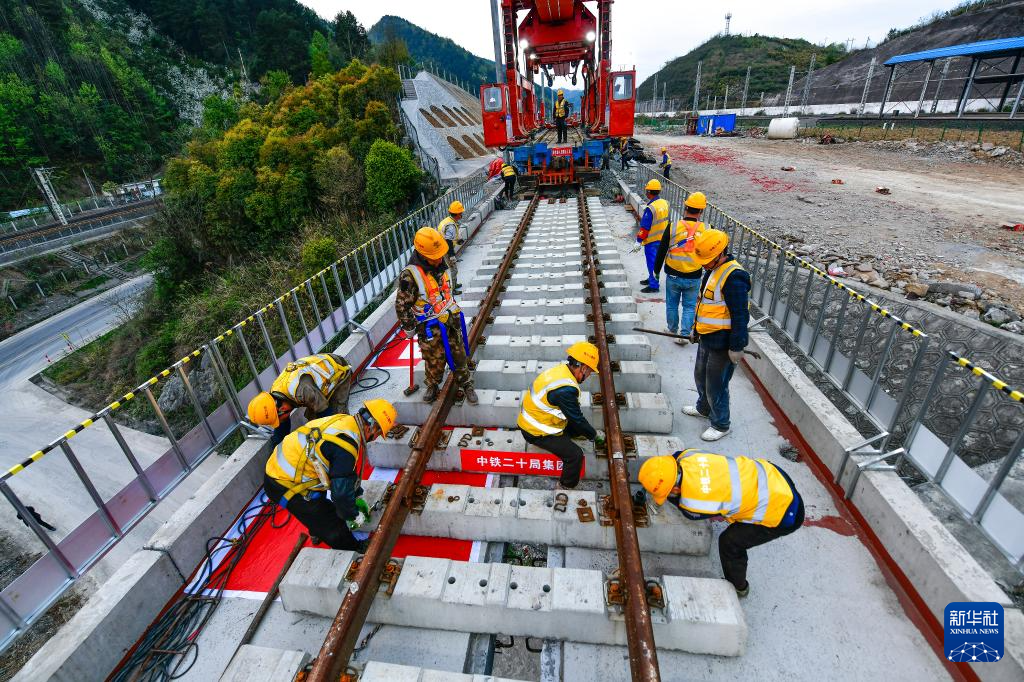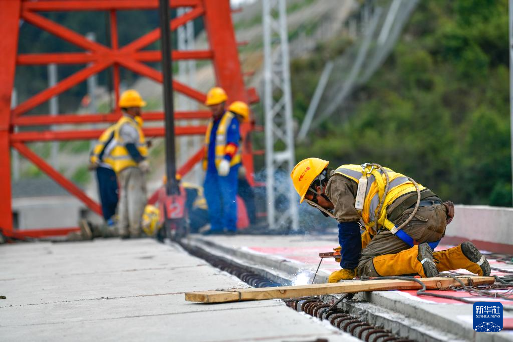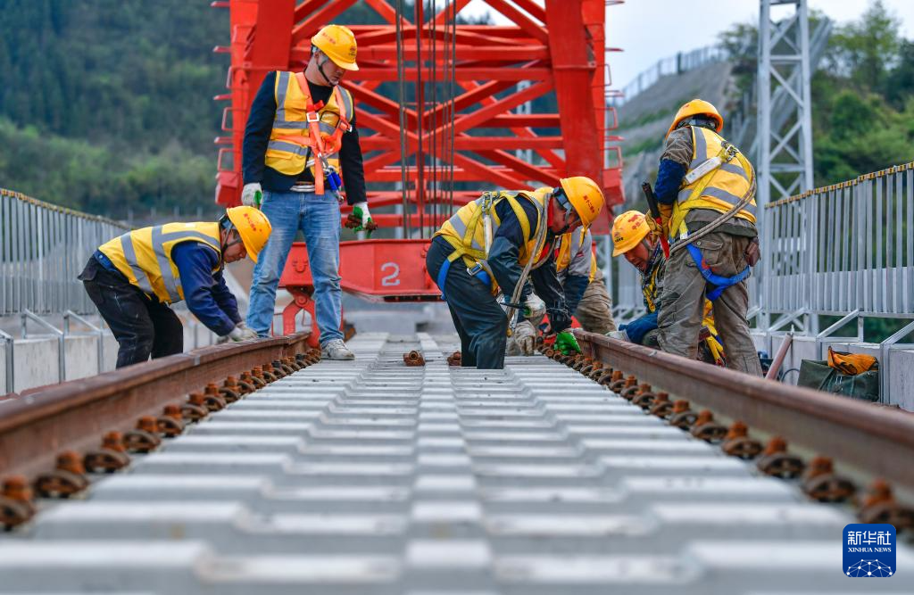 3月31日,工人在贵州瓮马铁路南北延伸线姜家坪大桥上铺设轨道。新华社记者 杨文斌 摄