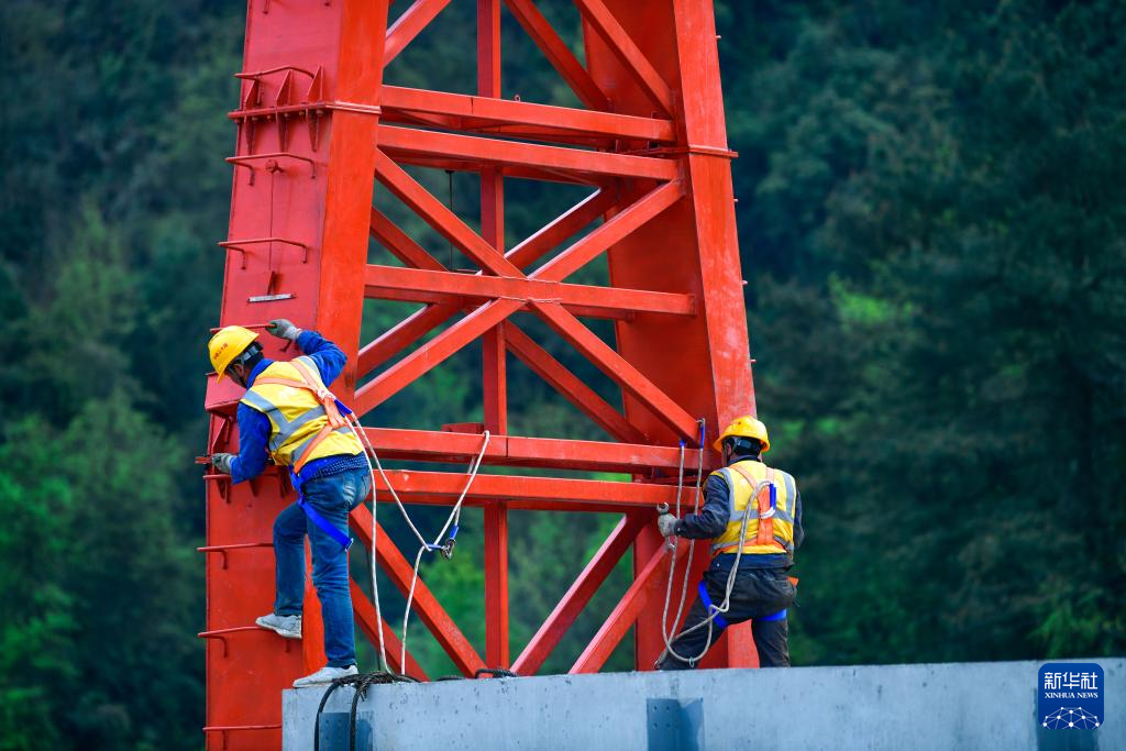 3月31日,工人在贵州瓮马铁路南北延伸线姜家坪大桥上架设T梁。新华社记者 杨文斌 摄