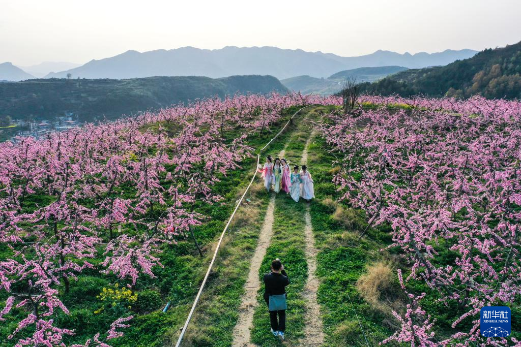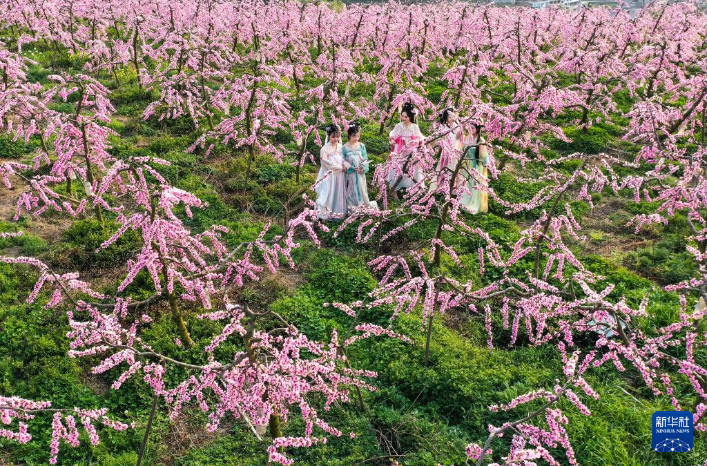 4月1日,汉服爱好者在贵州省贵定县德新镇新铺村黄桃种植基地游玩留影(无人机照片)。新华社记者 杨文斌 摄