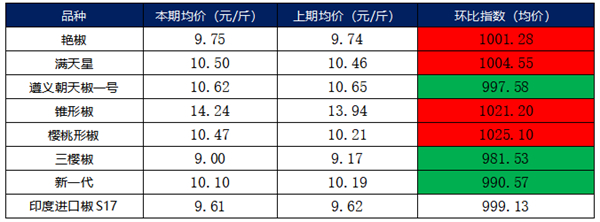 本期全国辣椒市场的8个辣椒代表品中,有4个代表品种(艳椒、满天星、锥形椒、樱桃形椒)交易平均价格较上期有所上涨;有3个代表品种(遵义朝天椒一号、三樱椒、新一代)交易平均价格较上期有所下跌;有1个代表品种(印度进口椒S17)交易平均价格较上期基本持平。其中樱桃形椒环比指数为1025.10点,是本期均价涨幅最大品种;其中三樱椒环比指数为981.53点,是本期均价跌幅最大品种。