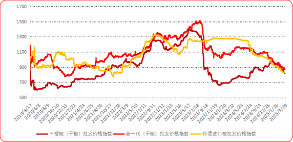 新华财经北京4月1日电(李欣仪)截至2025年3月30日,中国遵义朝天椒(干椒)批发价格指数报1231.82点,较上期上涨1.86%,其中艳椒、满天星、樱桃形椒批发价格指数较上期出现上行;遵义朝天椒一号、锥形椒批发价格指数较上期出现下行。三樱椒(干椒)批发价格指数报818.36点,较上期下跌1.50%。新一代(干椒)批发价格指数报864.16点,较上期下跌0.77%。印度进口椒批发价格指数报827.80点,较上期基本持平。