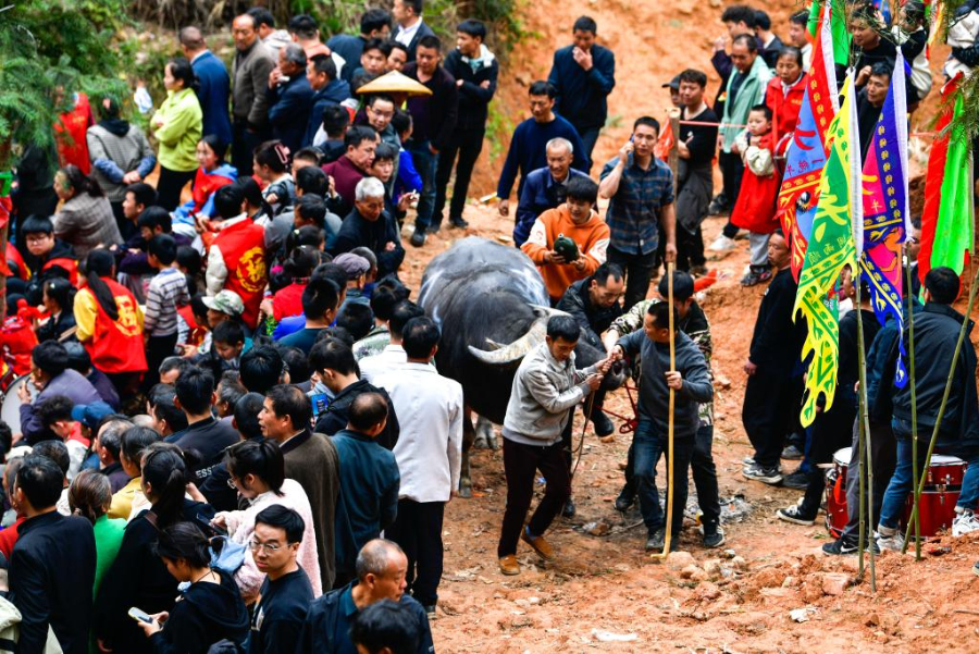 当日,贵州省黔东南苗族侗族自治州锦屏县固本乡举办2025年新民片区三月初九牯藏节斗牛民俗活动,来自各苗乡侗寨的人们齐聚斗牛塘,斗牛欢庆牯藏节。