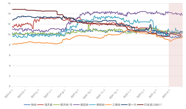 分析预测,4月份,艳椒均价区间预计9.31-9.65元/斤;满天星均价区间预计9.82-10.36元/斤;遵义朝天椒1号均价区间预计10.08-10.37元/斤;锥形椒均价区间预计13.35-14.21元/斤;樱桃形椒均价区间预计10.19-11.15元/斤;三樱椒均价区间预计8.36-9.20元/斤;新一代均价区间预计10.08-10.55元/斤;印度进口椒均价区间预计9.51-10.12元/斤。