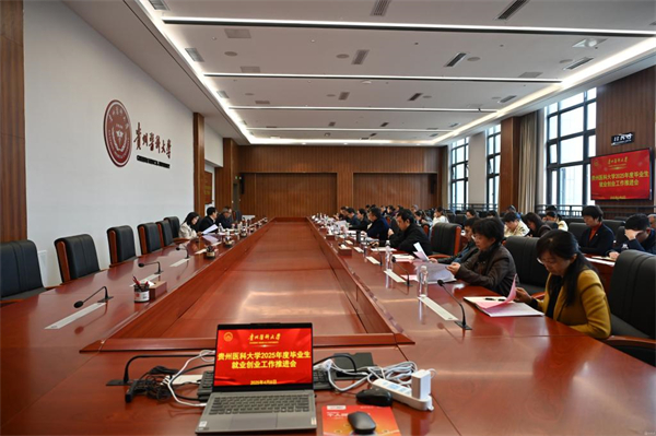 4月8日,贵州医科大学在云漫湖校区知雨楼六楼会议室召开2025届毕业生就业工作推进会。贵州医科大学党委副书记、校长罗鹏,校党委委员、副校长曾柱,校党委委员、副校长齐晓岚出席并讲话,相关职能处室、研究生院主要负责人,各学院党政主要负责人、分管学生工作副书记,招生就业处全体工作人员参加。会议由曾柱主持。