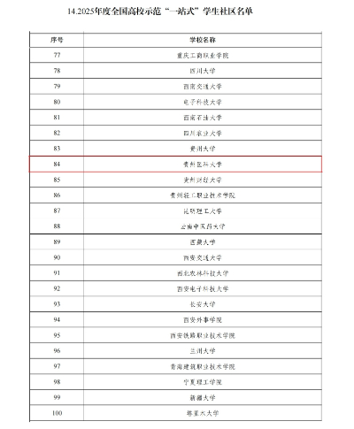 近日,教育部办公厅公布了2025年度高校思想政治工作质量提升综合改革与精品建设项目入选名单。贵州医科大学获2025年度全国高校示范“一站式”学生社区名单。