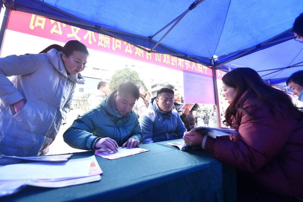 2025年2月8日,人们在广西柳州融水县粤桂劳务协作专场招聘会上了解岗位需求信息。柳州市融水县和对口帮扶的广东省廉江市依托粤桂劳务协作机制,通过“点对点”劳务输出服务、专场招聘会、直播带岗等多种举措,加大就业帮扶力度,不断拓宽就业渠道,帮助务工人员陆续赴粤返岗工作。新华社记者 黄孝邦 摄