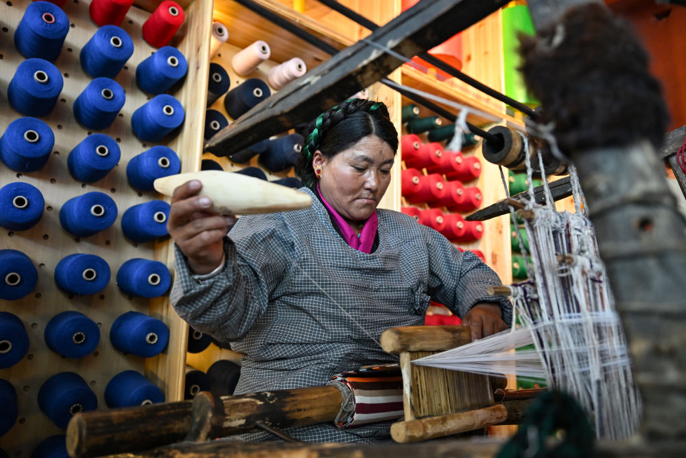 2024年9月3日,在西藏日喀则市江孜县班觉伦布村的阿佳格桑工坊,一名藏族村民使用传统织机编织氆氇。氆氇是藏族群众用来制作藏式衣物的毛织品,其工艺迄今已有上千年历史。在上海援藏帮扶下,这项传统技艺如今已成为当地妇女的致富新途径。新华社记者 孙瑞博 摄