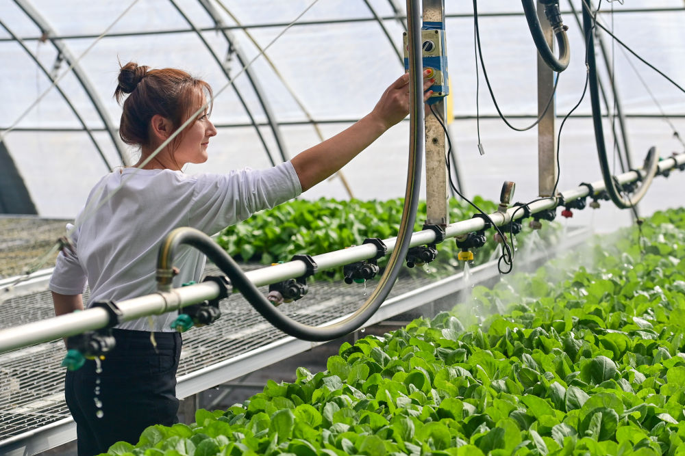 2024年3月22日,在新疆阿克苏市阿依库勒镇的蔬菜基地,种植户操作喷淋设备为幼苗浇水。新华社记者 丁磊 摄