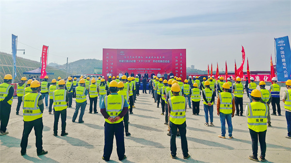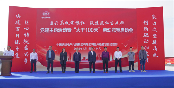 4月11日上午,中国铁建电气化局集团盘兴项目部在兴义市桔山街道酸枣村铺架基地举行“盘兴高铁党旗红、铁建筑虹争先锋”党建主题活动暨“建设标杆盘兴大干100天”劳动竞赛启动仪式,,标志着贵州省最后一个“市市通高铁”项目的强电施工进入攻坚关键时期。