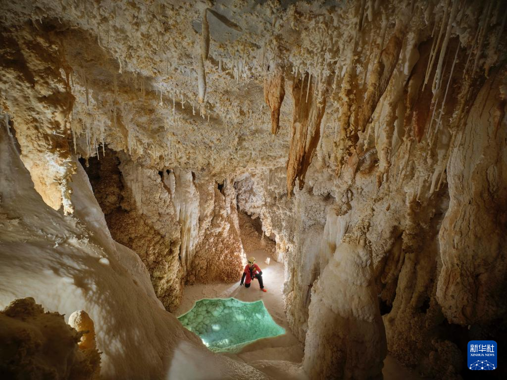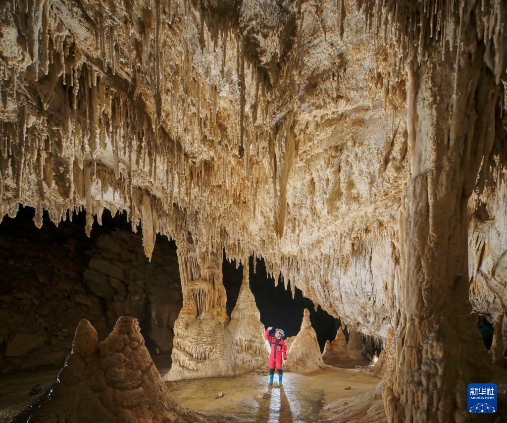 探险队员在洞内发现的钟乳石景观。新华社发(赵揭宇 摄)