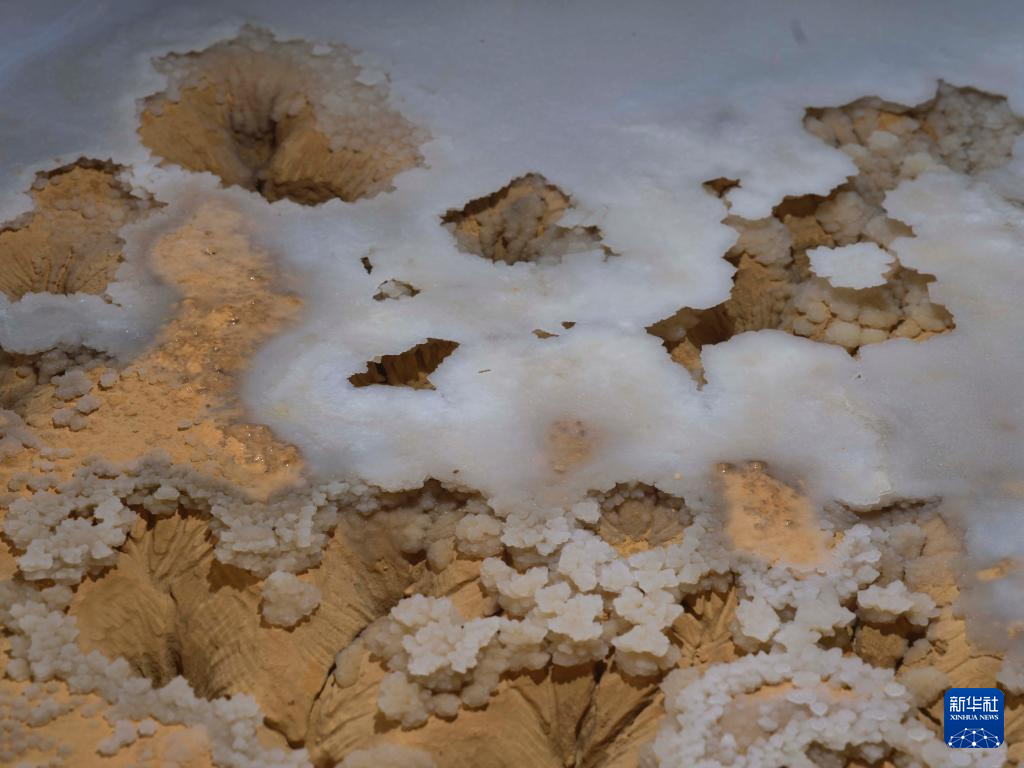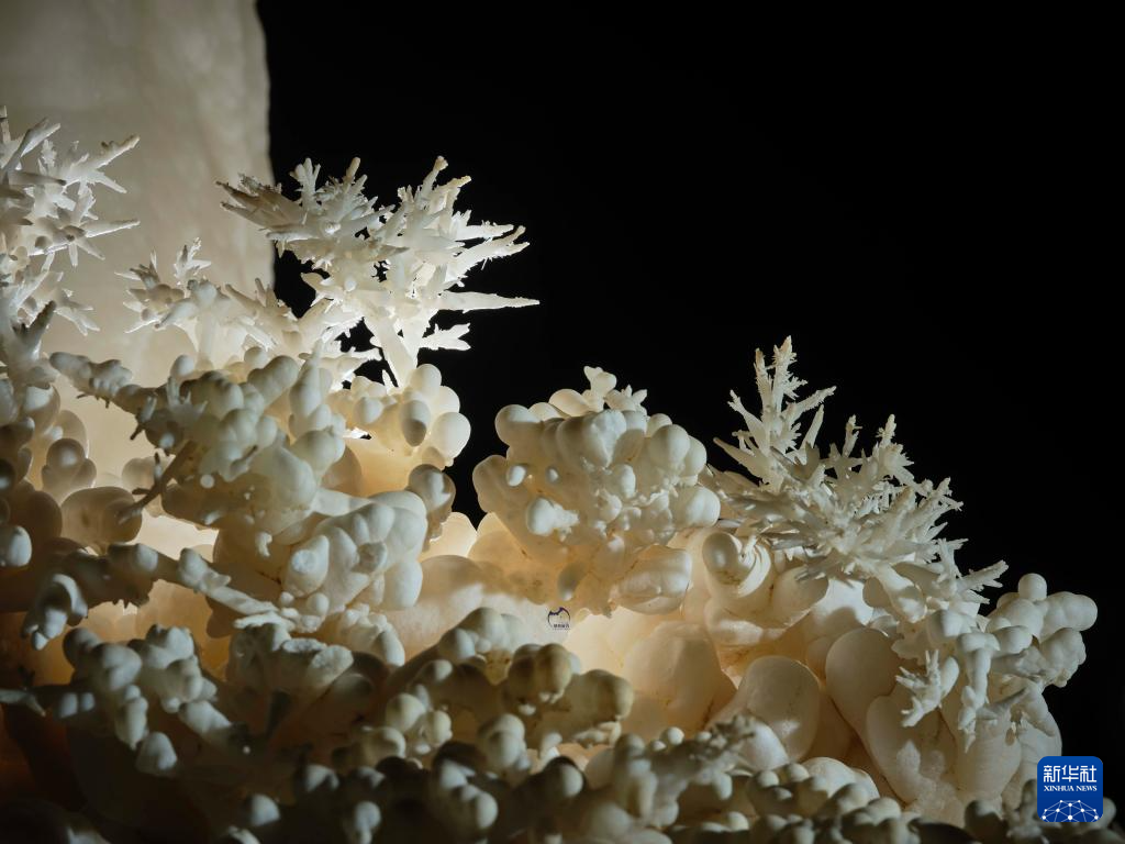 探险队员在洞内发现的“石葡萄”上长“石花”景观。新华社发(赵揭宇 摄)