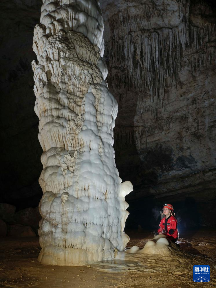 探险队员在洞内发现的纺缍石景观。新华社发(赵揭宇 摄)
