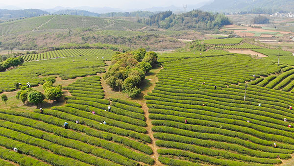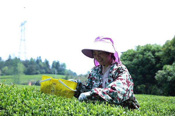 清晨7点,茶园里已是一派繁忙景象。茶农们背着竹篓、端着篮子,在青翠的茶垄间娴熟地采摘鲜叶。茶农曾妹一边采摘一边笑着说:“天刚亮就来采茶,一天能挣几十块钱,既不耽误家里农活,还能贴补家用,挺好的!”
