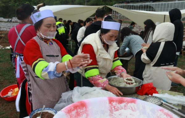徒步者既能观赏到珍稀的树龄上千年的古杜鹃,还可沿途参与"花间寻宝"活动——在特定点位收集装有纸条的非遗盲盒,即可兑换精美礼品及清明粑制作体验券。徒步终点正好设在农耕文化体验区,刚徒步完的游客们又开始跟着村民学习制作清明粑,一阵忙碌后,游客们快乐地品尝到了自己亲手制作的清明粑。活动现场还同步展销了野生蜂蜜、纯粮米酒、蜡染书签、地戏脸谱等10余种生态文创产品,吸引了游客驻足观看购买。