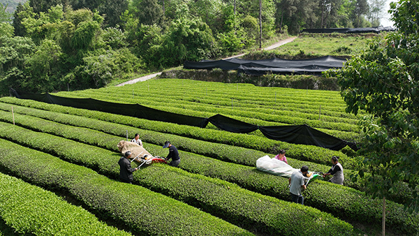 走进德江县龙泉乡牧羊岭村的山间,这里的绿茶被茶农潘元江组织工人附上了一层黑膜,掀开一瞧,只见每垄茶树上茶芽长势喜人,格外齐整。