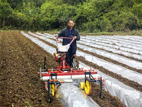 凯本镇沈家湾村烟农雷志双正在使用自动覆膜机给烟地覆膜。(杨德康 摄)