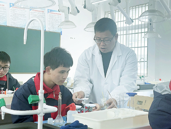 李荣彬(右)指导学生做实验。