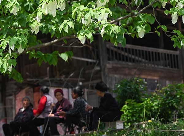 4月18日,松桃苗族自治县乌罗镇毛溪村的村民在鸽子花树下乘凉、唠嗑。(谢慧芳 摄)
