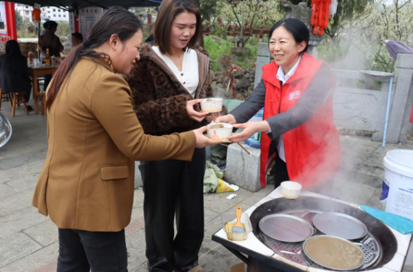 近午时分,景区内提供餐食的各色摊点升起袅袅炊烟,赵春梅的菜饭香也在花海中氤氲。“李花节一来,游客多得很,我特意把家里的大锅搬进来焖菜饭,就怕不够卖。”在这位卷烟零售户兼任的“厨娘”摊位前,菜饭的油香、油糍的酥脆与苕粉的糯滑,正演绎着传统风物与现代消费的跨时空对话,不少游客被香味吸引过来消费。“以前也想来景区摆摊增加收入,但是人手不够不能两头兼顾,今年有‘零户帮’的成员帮忙,我也搭上了一回文旅促销的快车。”