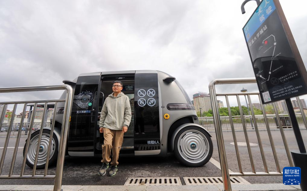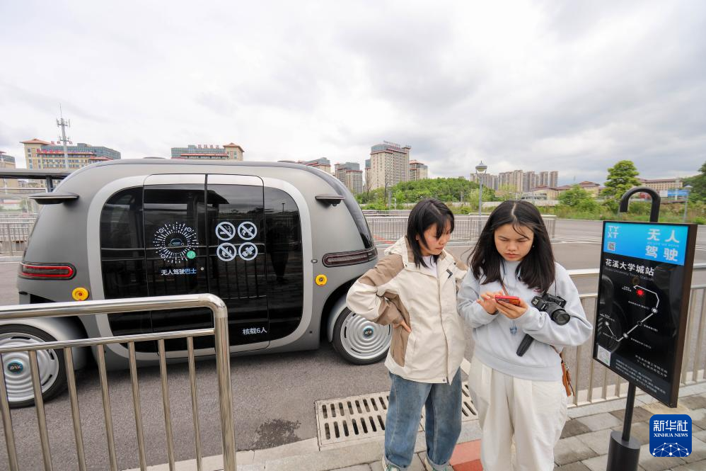 4月24日,参与体验活动的市民在贵阳市花溪大学城公交车站试乘无人驾驶公交车。新华社记者 刘续 摄