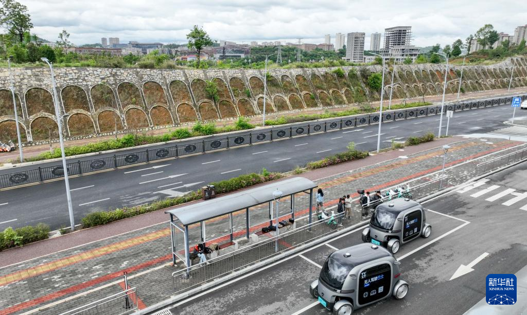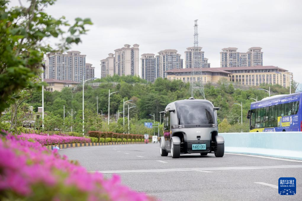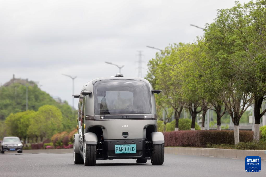 4月24日,无人驾驶公交车在贵阳市花溪大学城公交车站附近行驶。新华社记者 刘续 摄