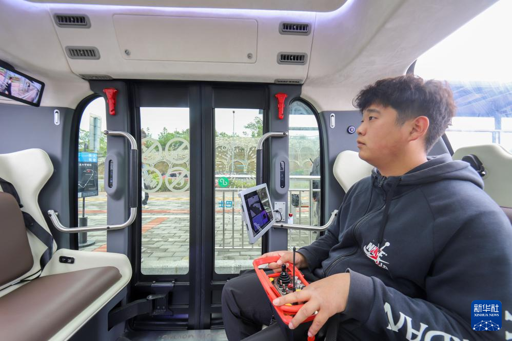 4月24日,安全员在调试无人驾驶公交车。新华社记者 刘续 摄