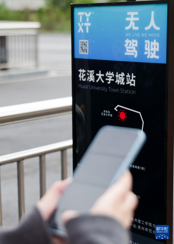 4月24日,在贵阳市花溪大学城公交车站,前来参与体验活动的市民在扫码试乘无人驾驶公交车。新华社发(袁福洪摄)