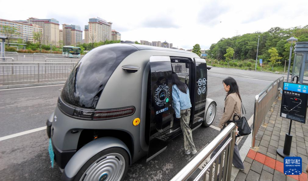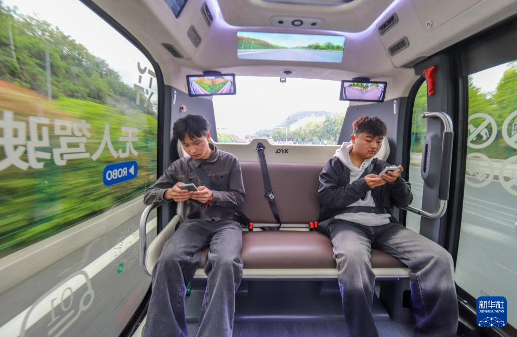 4月24日,参与体验活动的市民在贵阳市花溪大学城试乘无人驾驶公交车。新华社记者 刘续 摄