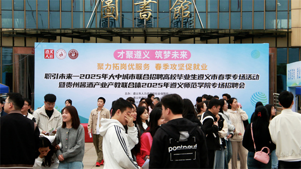 为贯彻落实“春季促就业攻坚行动”,以及人力资源和社会保障部“高校毕业生春季专场活动”工作部署,推动学校与贵州酱酒产业产教融合、服务地方经济发展、促进毕业生高质量充分就业,4月23日,在贵州省酱酒产业产教联合体成立的契机下,在贵阳市司法局、遵义市人力资源和社会保障局、遵义市就业局等单位的支持下,学校在星空广场举办“职引未来——2025年全国城市联合招聘高校毕业生遵义市春季专场活动”暨贵州酱酒产业产教联合体2025年遵义师范学院专场招聘会。