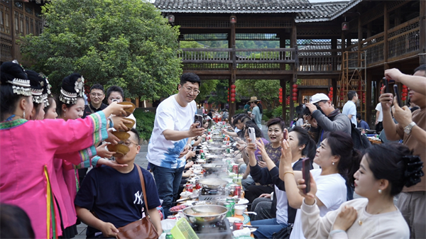 游客体验“长桌盛情”宴八方长桌宴。(黎平县融媒体中心供图)