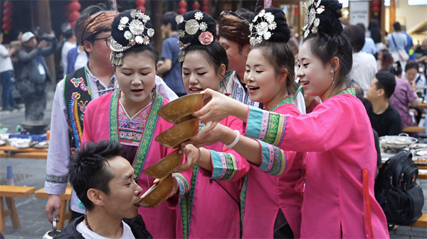 长桌宴上侗族姑娘展现“高山流水”。(黎平县融媒体中心供图)