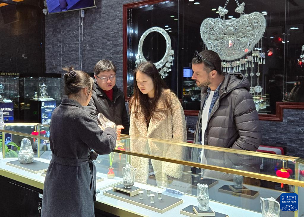 2月18日,意大利设计师(右一)在贵州采风获取设计灵感。新华社发