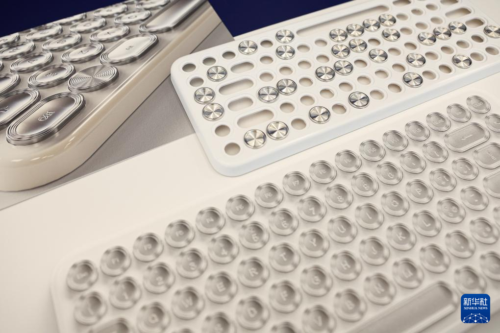 这是4月13日在意大利米兰设计周贵州工业设计城展区拍摄的由中意共同合作设计的银饰键盘。新华社记者 李京 摄