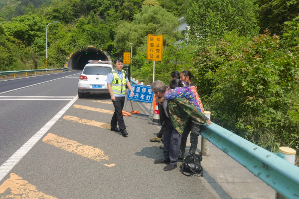 当日,两名执法人员巡查至事发路段时,发现高速公路隔离栅内出现4名形迹可疑人员。现场画面显示:一名约50岁的女性痛苦伏在男子背上,另有两名女性神情焦灼地四处张望。执法人员立即规范开启车辆应急警示设备,在安全区域停车取证。经初步询问得知,该群体系厦蓉高速排洞隧道周边村民,其中伤者为爬树采摘树茶不慎跌落导致下肢瘫痪,家属为送医救治联系了非法营运车辆,约定翻越隔离栅违规乘车。然而约定的"黑车"迟迟未现,伤者情况危急。