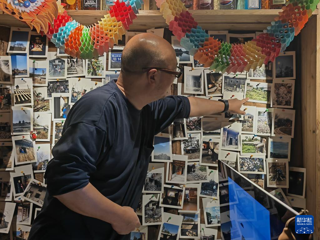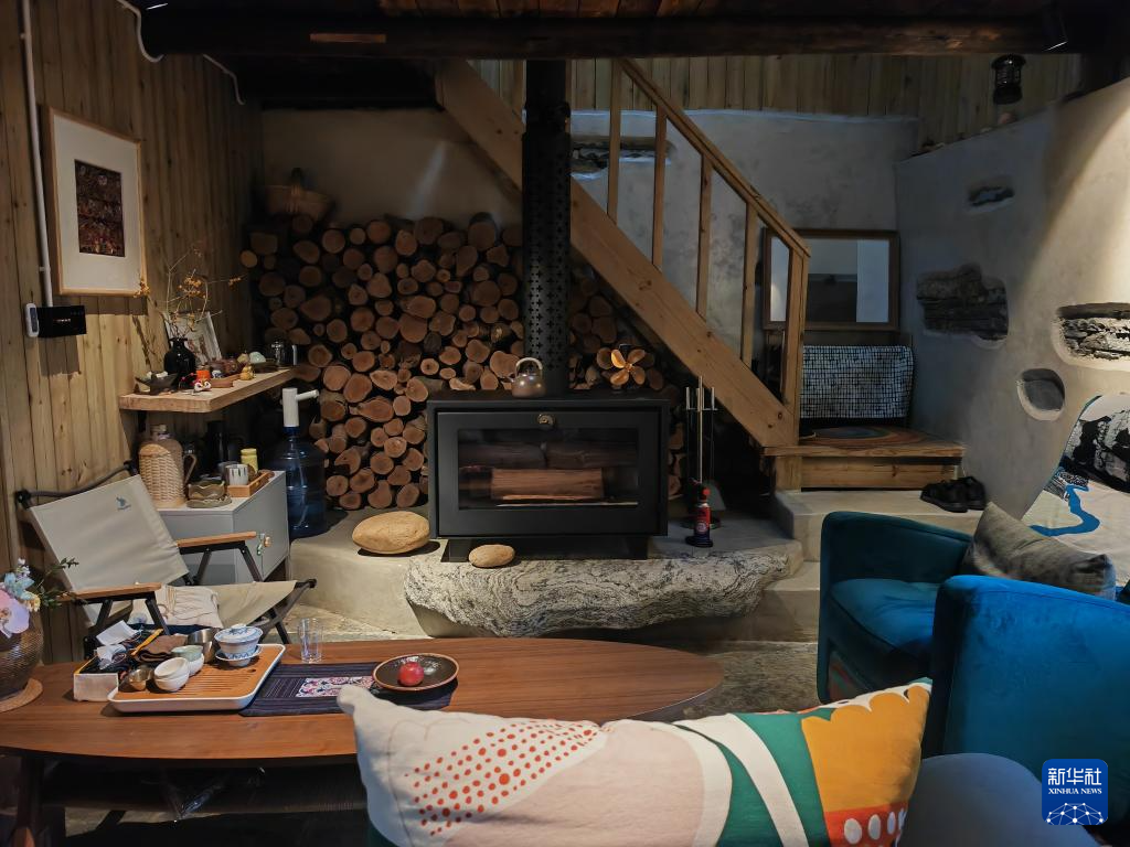 屋内的一面照片墙记录了改造过程。记者看到,腐朽的梁柱被重新加固,斑驳的石墙被雕刻涂画,屋内还加装了可烧柴火的壁炉,温暖的设计细节让人舒适。
