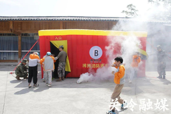 在贵州溥博研学劳动教育实践基地,关岭自治县实验学校的300多名学生正在教官的指导下了解和体验灭火器的正确使用方法,随后分批次走进地震灾害模拟教室、火灾模拟房,切身感受地震灾害发生时的晃动感和烟雾缭绕的火灾场景,并按照所学到的要点有序跑出教室,来到安全地点集合。